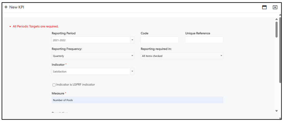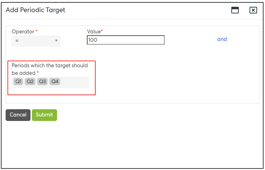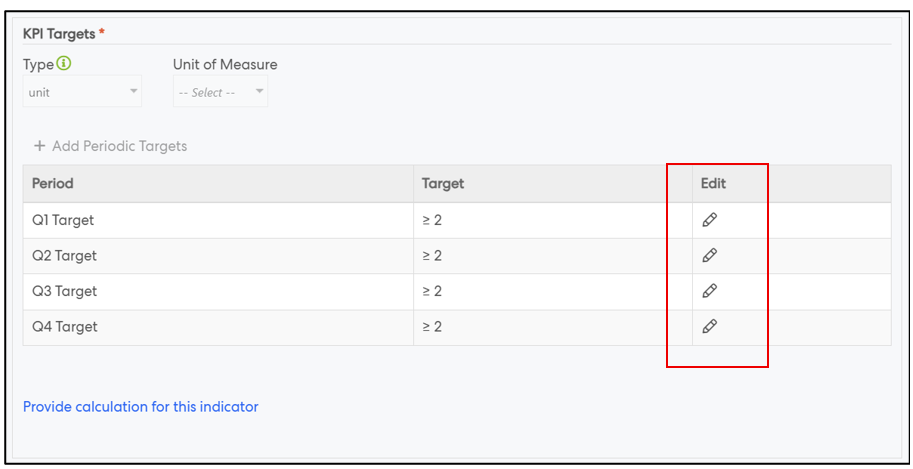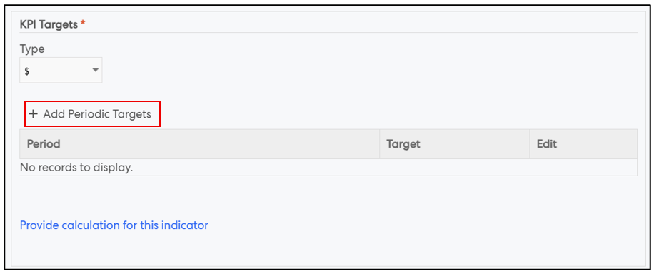 The targets section in the New Indicator pop-up, has been improved. Once the users selects a Type (%, $, Unit, Select List, Textual) and ability to add targets for specific periods using the '+ Add Periodic Targets' button is provided.