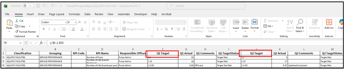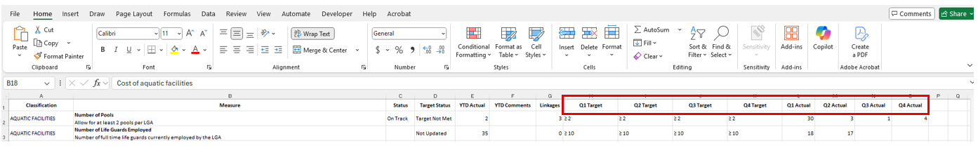 Actual columns now show Target + Actual together (with bold labels and line breaks).