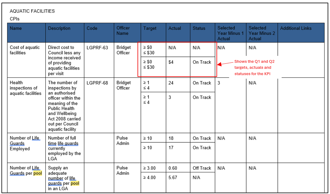 Target column replaced with period-wise target columns, e.g.: Q1 Target, Q1 Actual, - A screenshot of KPI Progress Report (screenshot 1) and CPI Configurable Report from Document Generator section (screenshot 2) below for reference