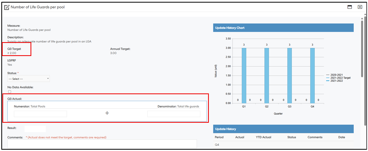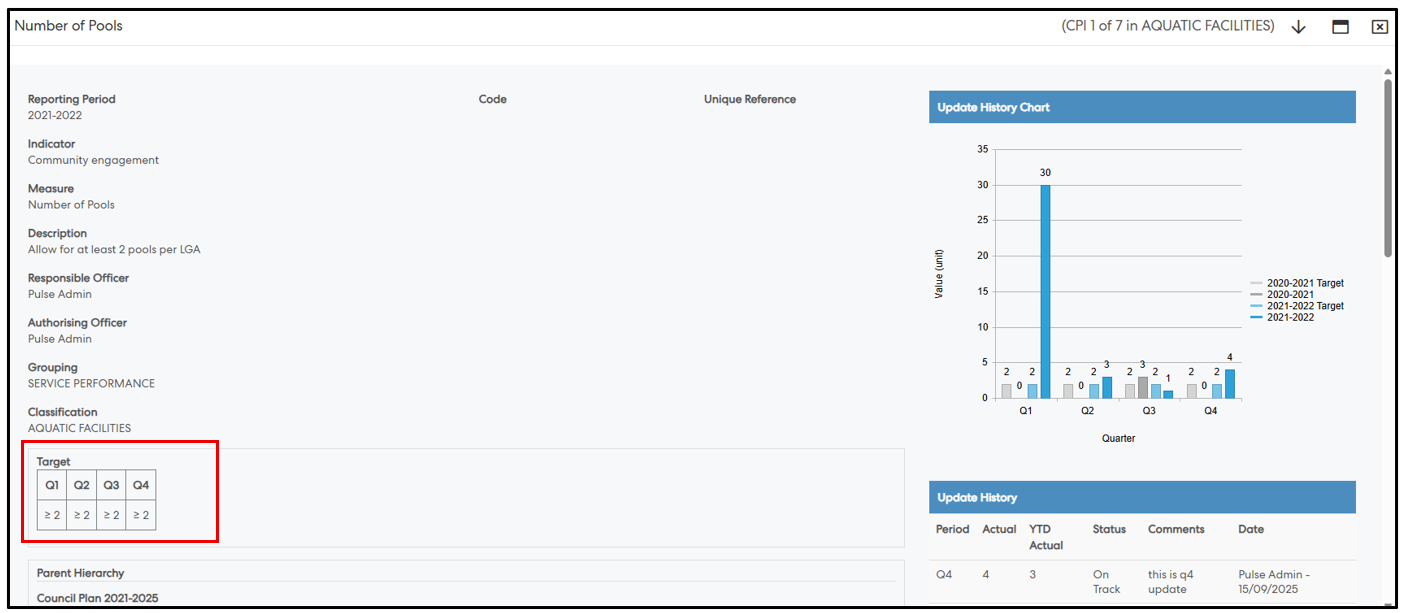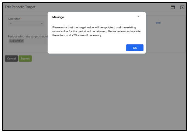 When the Type or Frequency is changed, any previously defined targets will be removed. A prompt will inform the user that while progress updates for the period will be retained, they should review and update them as needed. This change may also affect YTD calculations depending on the configuration.