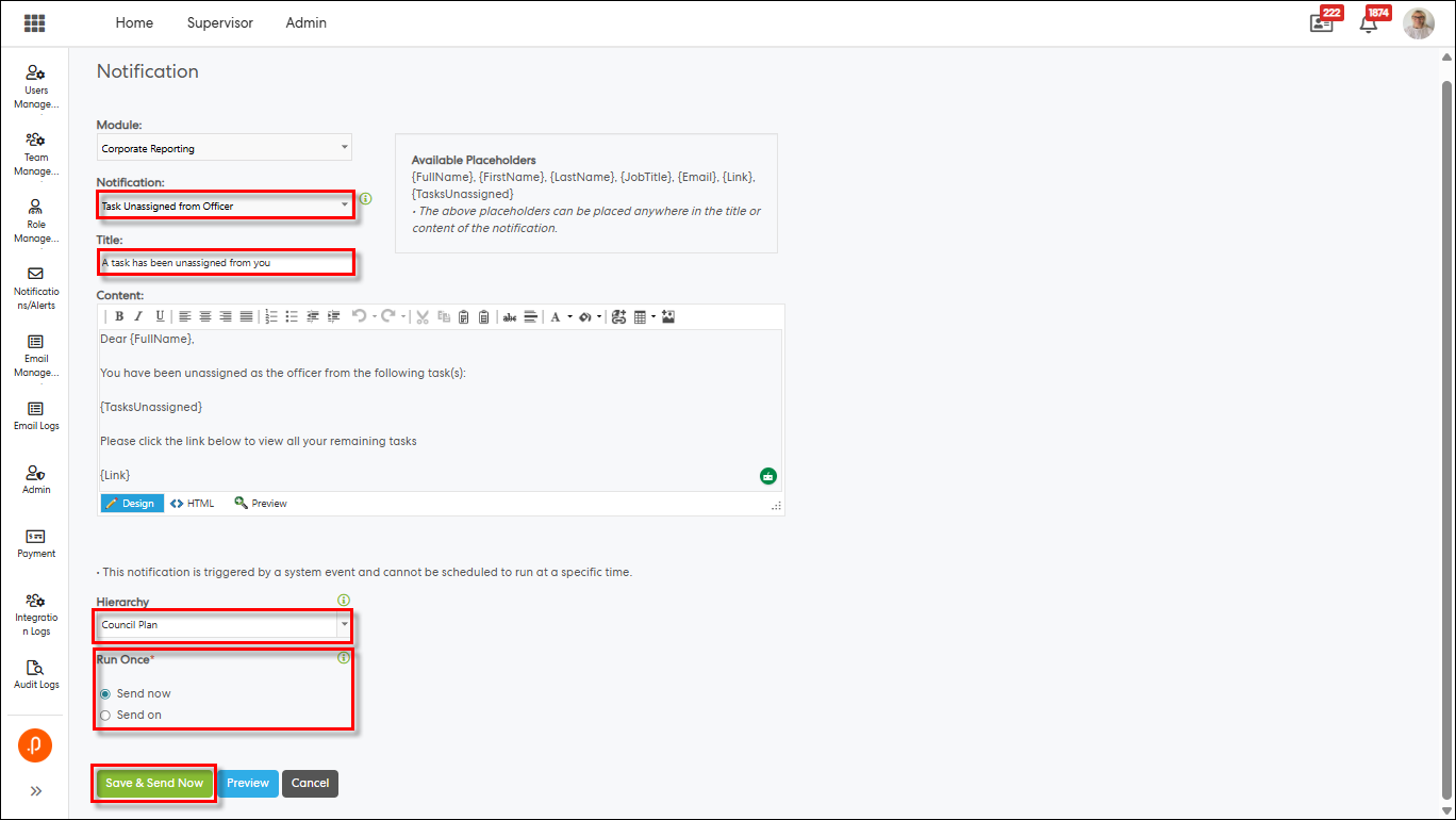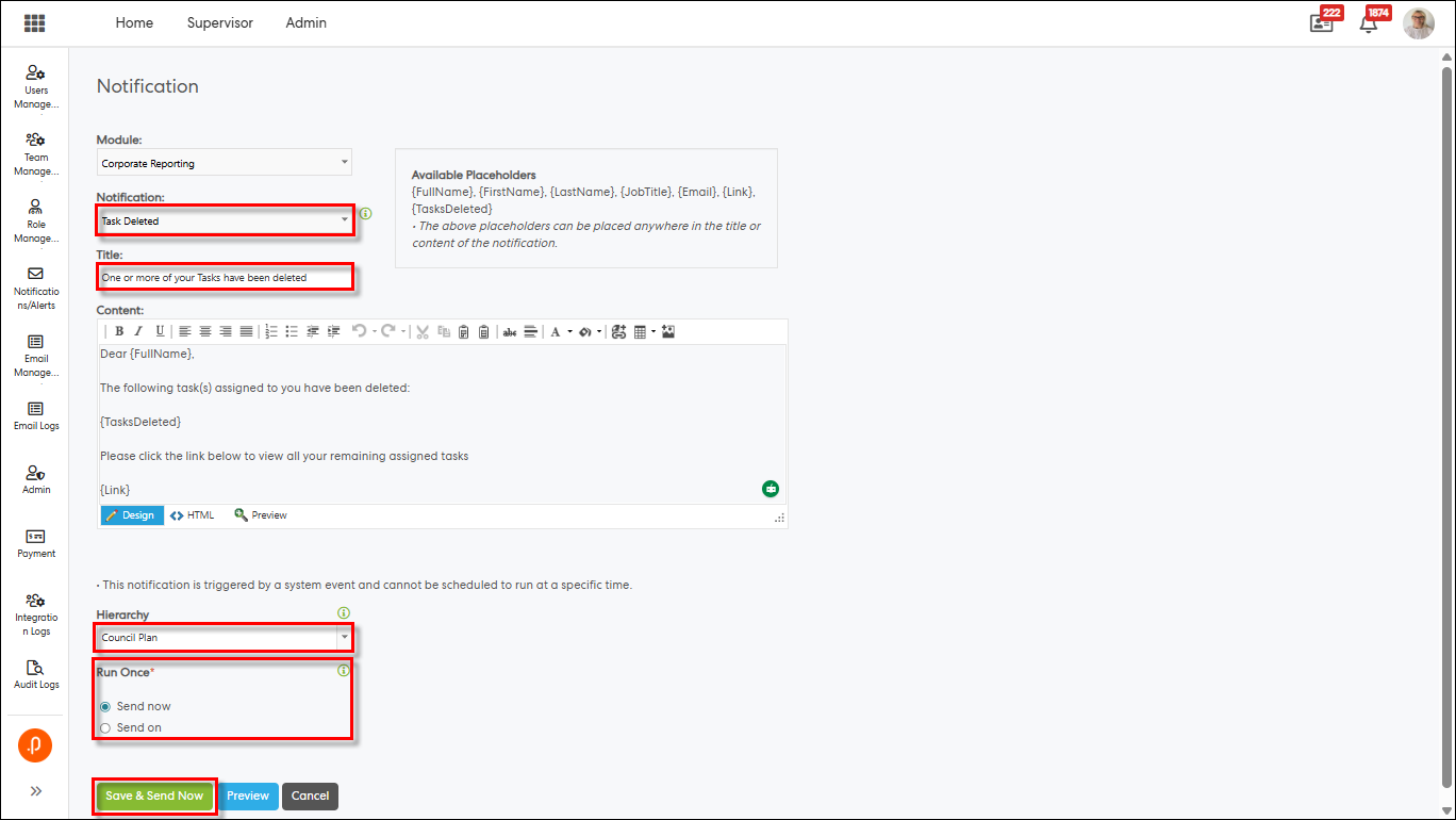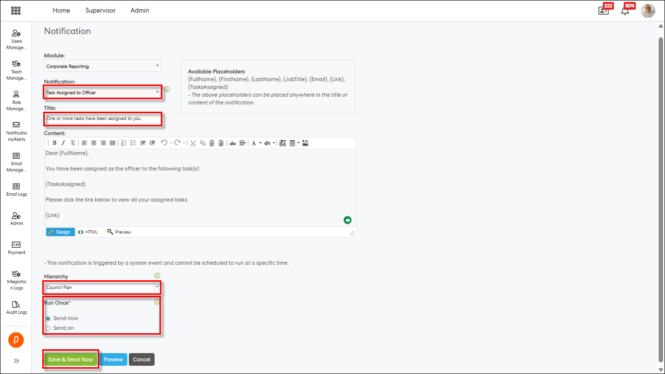 Step 5: Preview and activate the notification using Send Now or Send On options.
