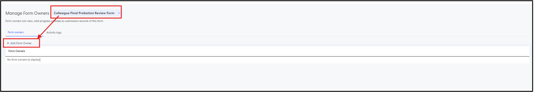 Step 4: In the Form Owner tab, click the + Add Form Owner button. The Add Form Owner pop-up is displayed.