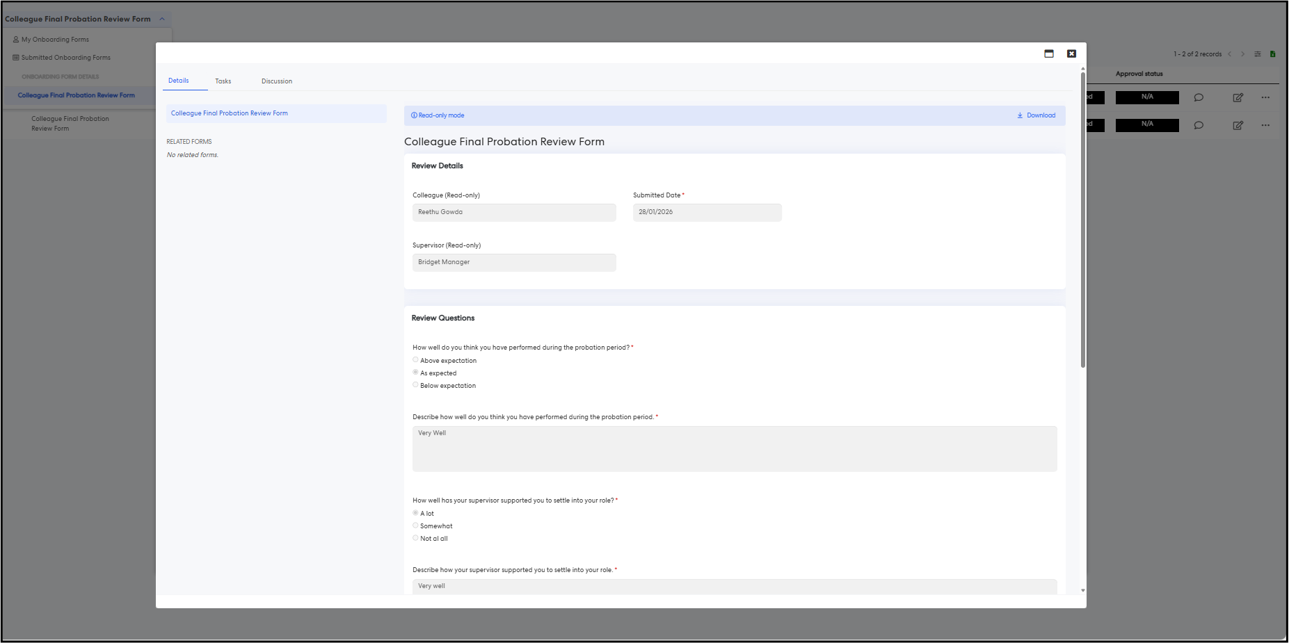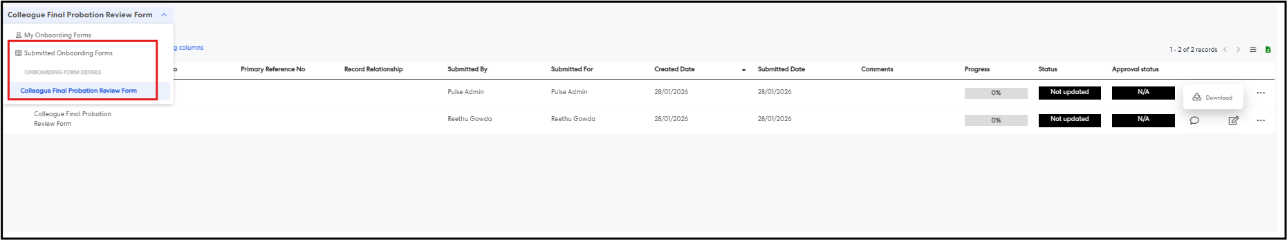 - The Individual Form view (for example, Colleague Final Probation Review Form) shows records submitted specifically for the selected form.