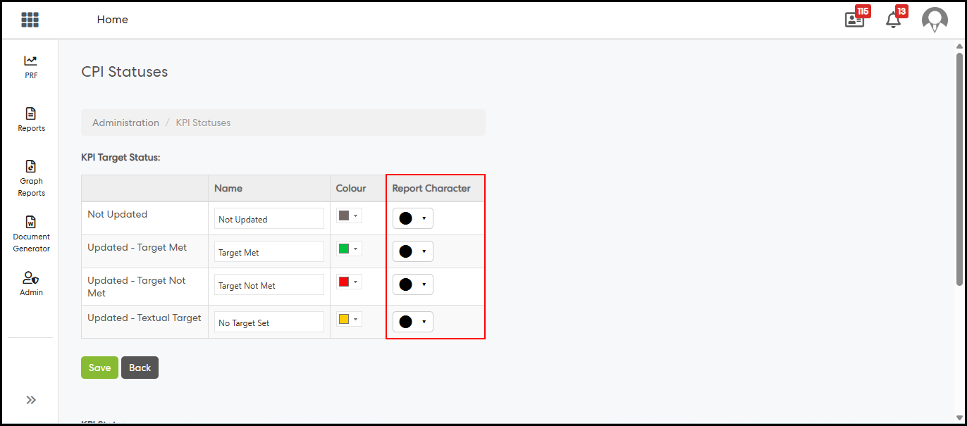 The Document Generator has been enhanced to support a new Target Status Traffic Light column, along with configurable Report Characters (symbols) for CPI/KPI Target Statuses. This feature is available in CPR and PRF Document Generator reports where the “Show CPI Table” option is enabled. It allows administrators to represent Target Status using a consistent visual indicator (colour + symbol), improving readability and enabling users to quickly interpret performance without relying on text-based values.