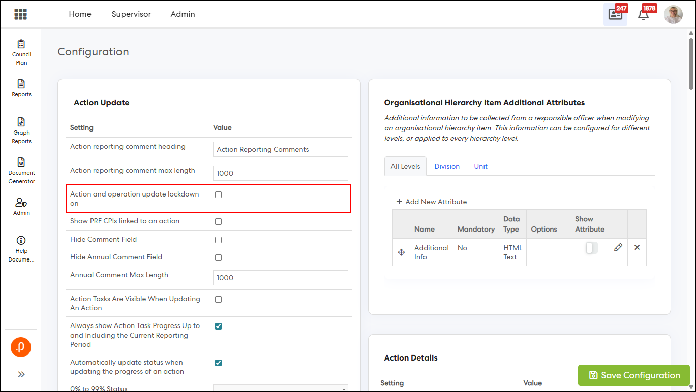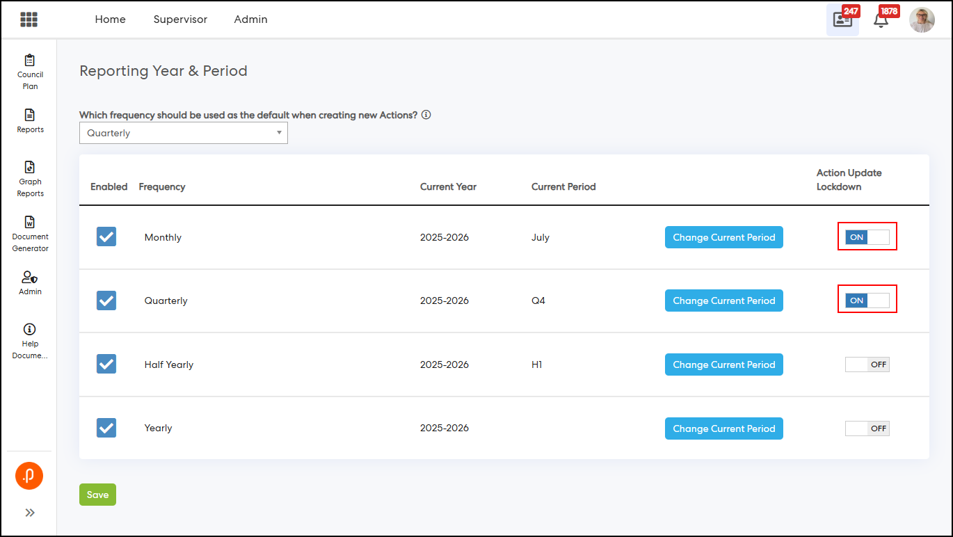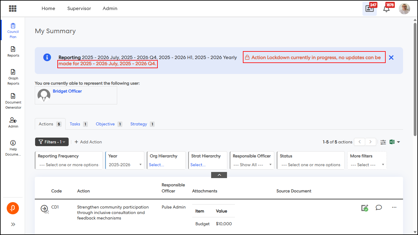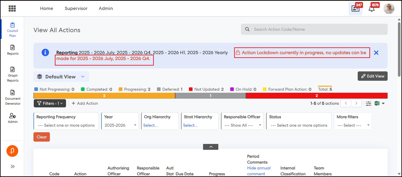 1.3 Action Update Lockdown Banner with Period VisibilityThe My Actions and All Actions pages have been enhanced to display a banner indicating the specific reporting period(s) where action updates are locked. This behaviour applies when the “Action and Operation Update Lockdown On” configuration key is disabled and one or more reporting periods are locked via ‘Reporting Year & Period’ settings.