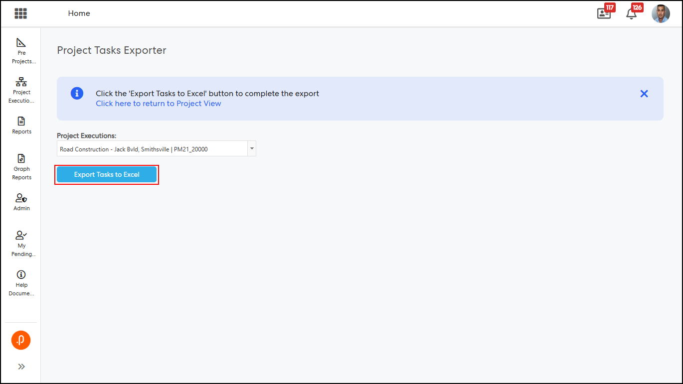 Step 1: Navigate to Project Executions > View Project > Tasks tab, then click Download Import Template > Export Tasks to Excel to download the Task Import Template.