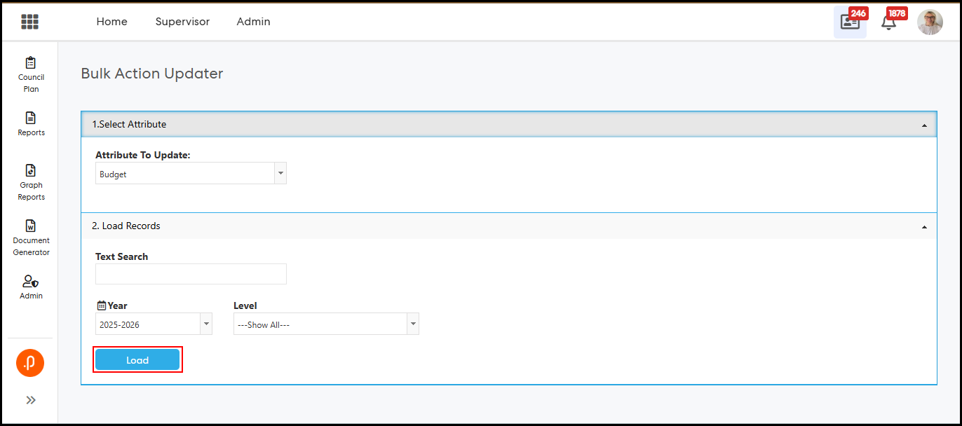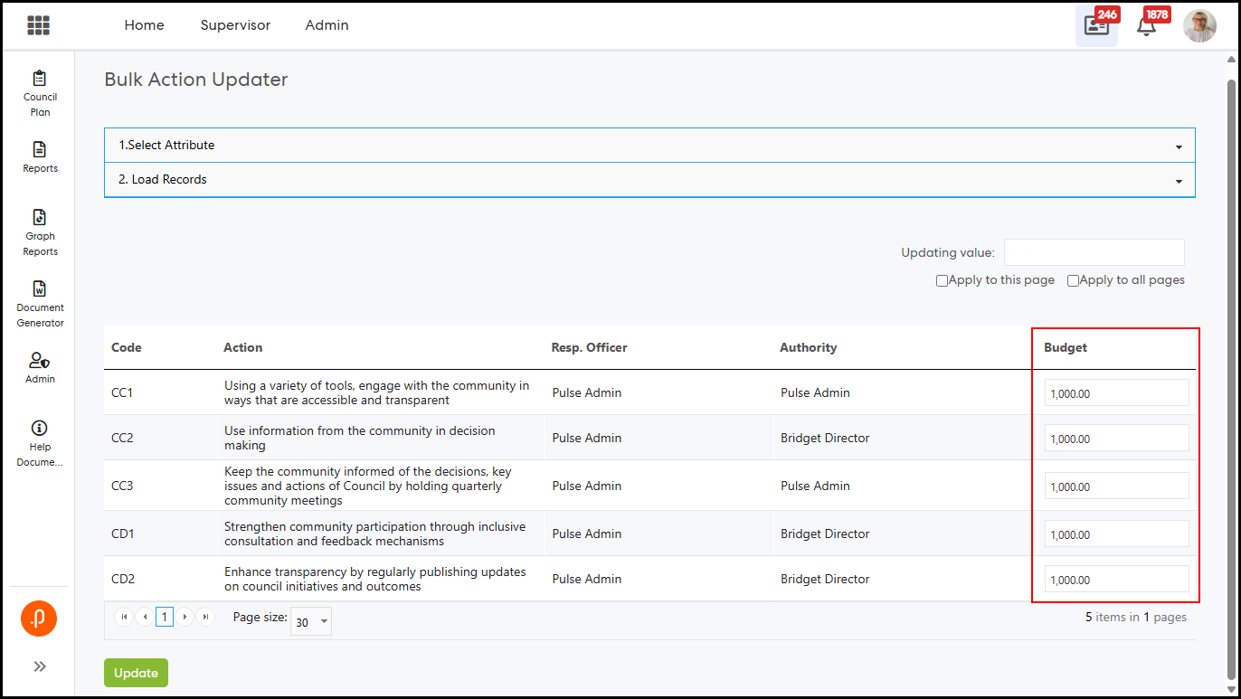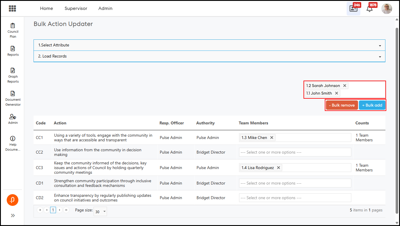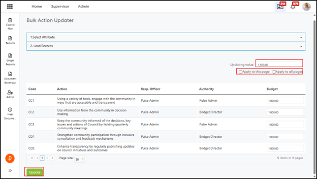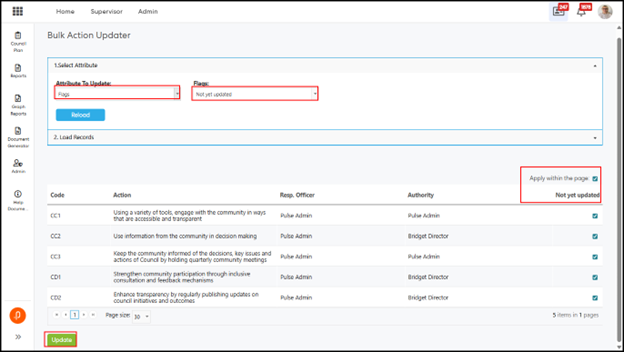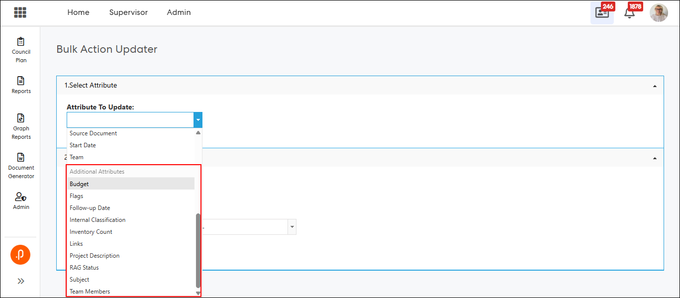 1.1 Bulk Action Updater – Support for Configurable Additional AttributesThe Bulk Action Updater has been enhanced to support configurable Additional Attributes (AAs) defined within the Action Add/Edit/View screen. This enables administrators to update these attributes in bulk, eliminating the need for individual record updates and improving overall efficiency.