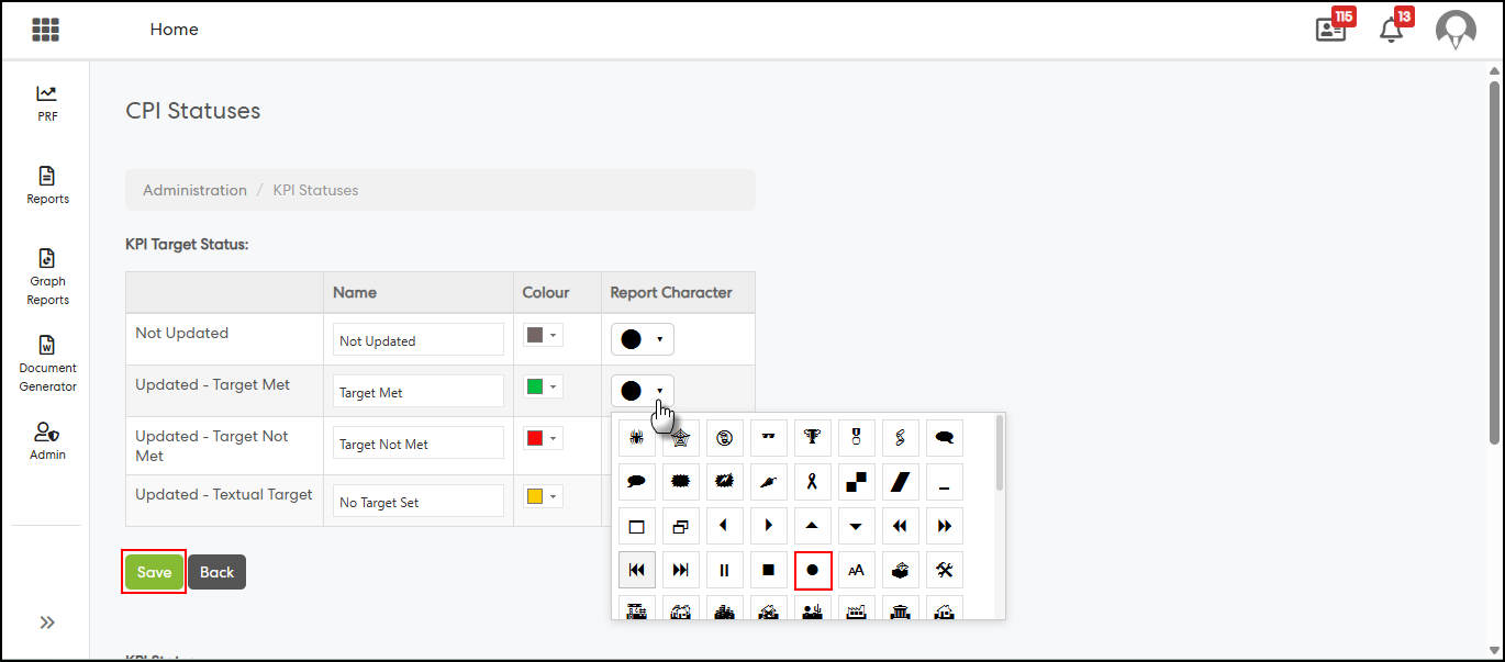 Step 3: Select a symbol from the Report Character dropdown for the required Target Status, then click Save.