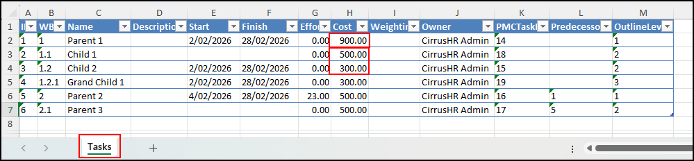 - The import will proceed successfully only when all parent and child task costs are consistent.