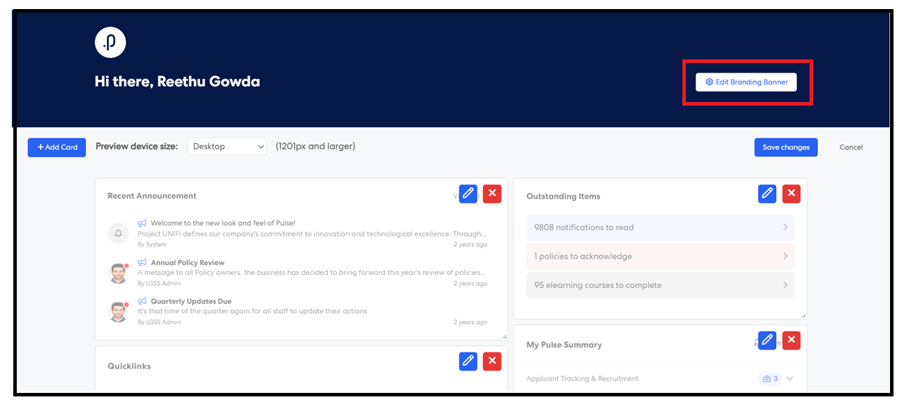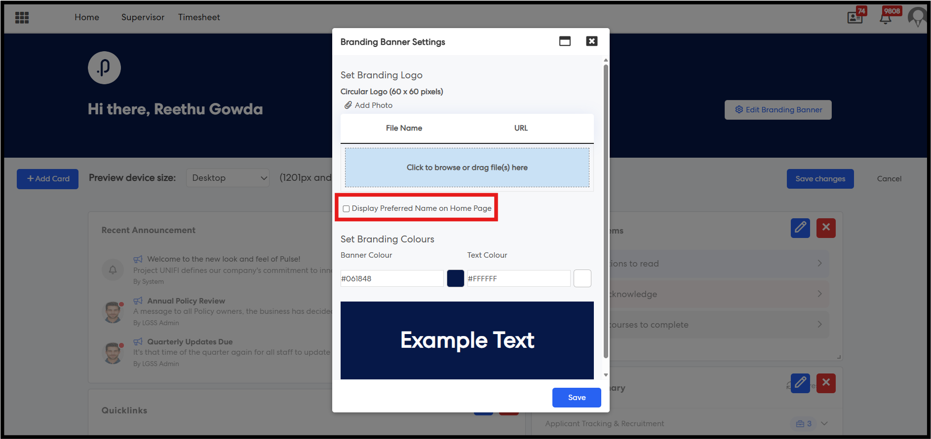 Step 4: In the Banner Settings popup, locate the new checkbox: “Display Preferred Name on Home Page” (disabled by default).