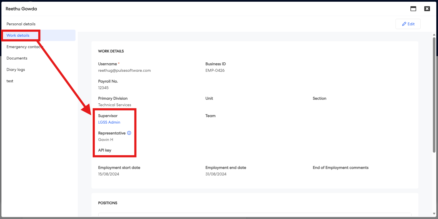 Step 5: Navigate to the Work Details tab. Hover over the Supervisor or Representative name to view the clickable state.