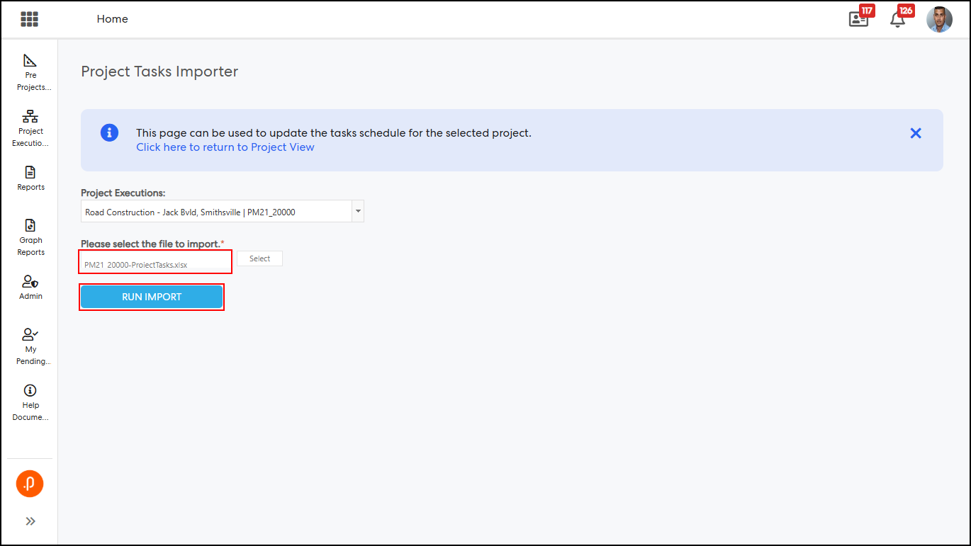 Step 3: Return to the Tasks section, click Import Tasks, select the updated template, and click Run Import.