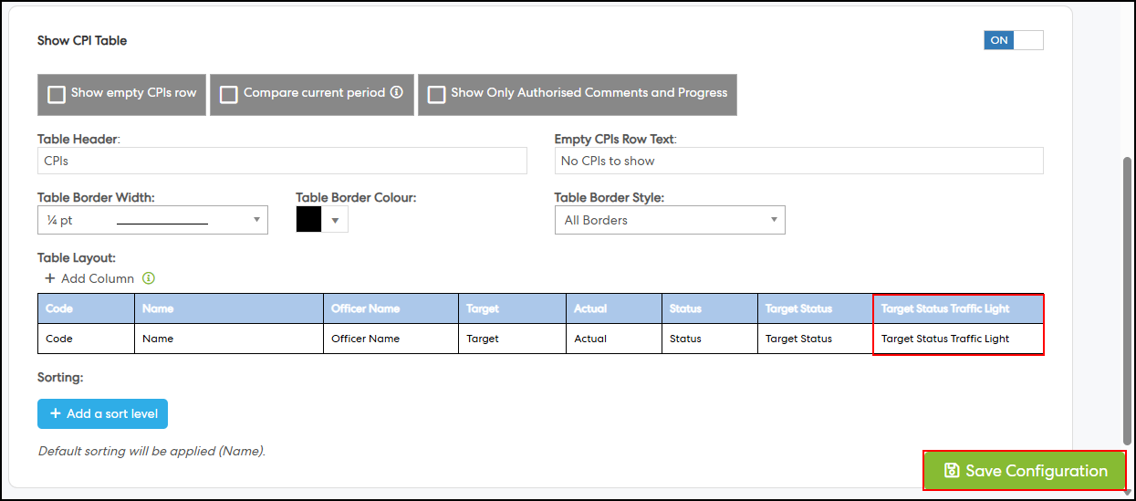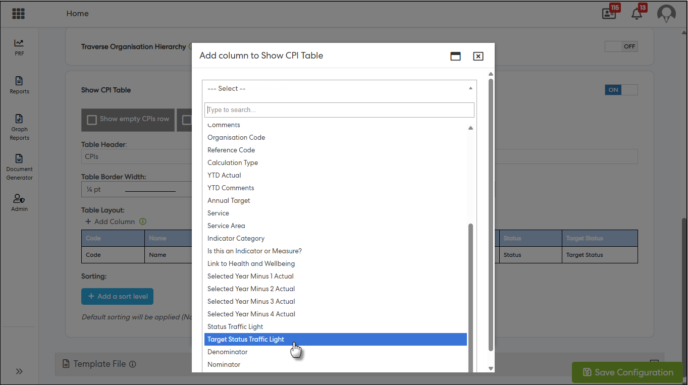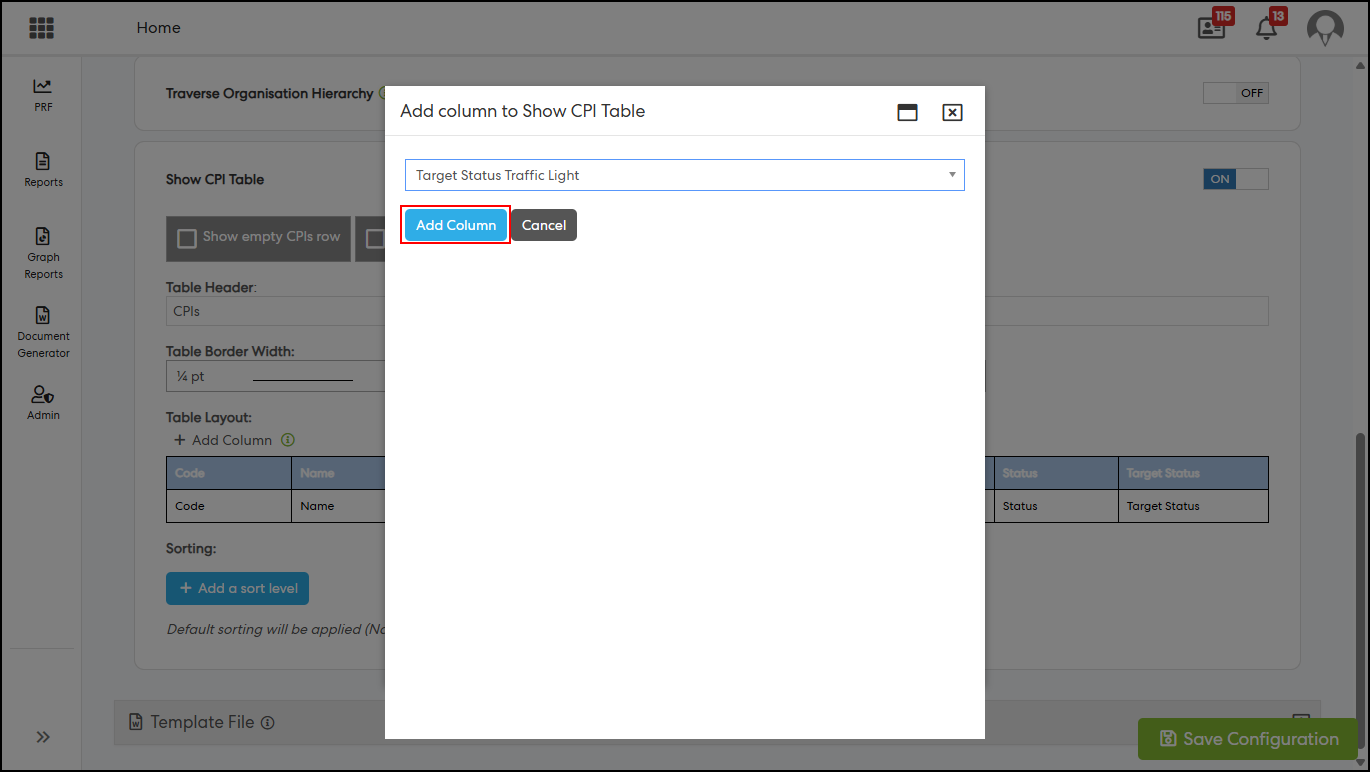 2. Introduced a new “Target Status Traffic Light” column under CPI Table configuration in the following Document Generator reports: