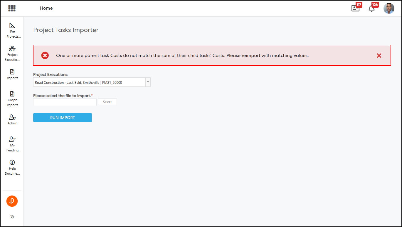 3.1 Task Import Cost Validation EnhancementThe Project Task Importer has been enhanced to validate that each parent task cost matches the sum of its child task costs during import. This ensures data consistency and prevents incorrect cost aggregation by stopping the import process when discrepancies are detected.