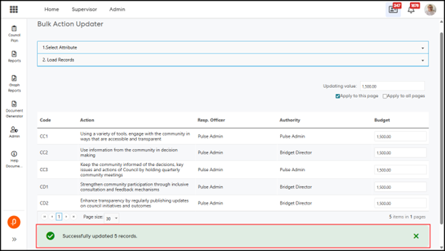 A confirmation message is displayed showing the number of successfully updated actions.