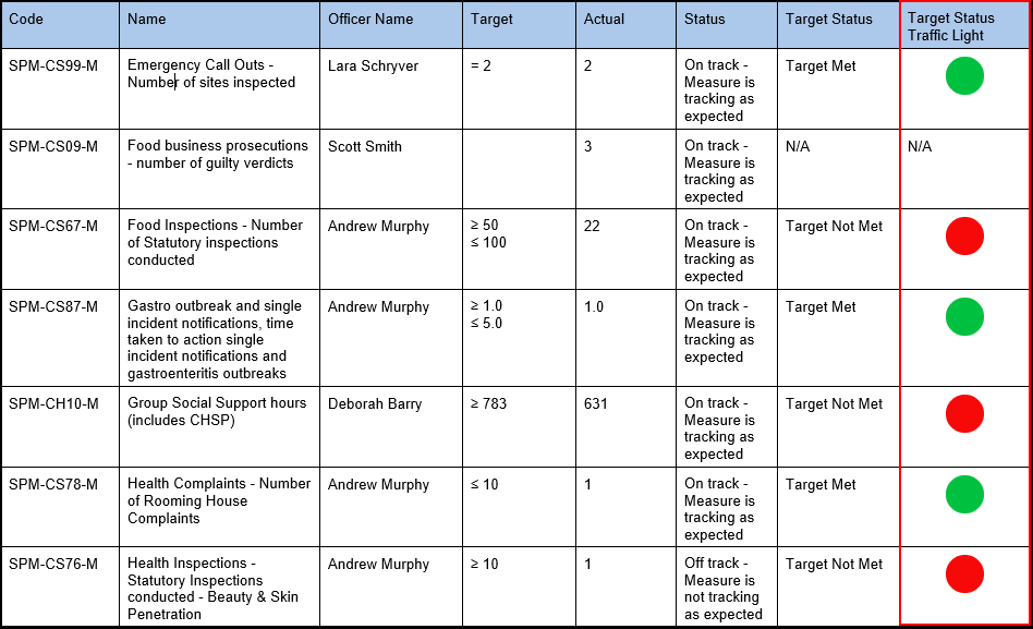 Step 7: Generate the report and review the output. The Target Status Traffic Light column will display the configured Report Character with the corresponding colour for each Target Status.