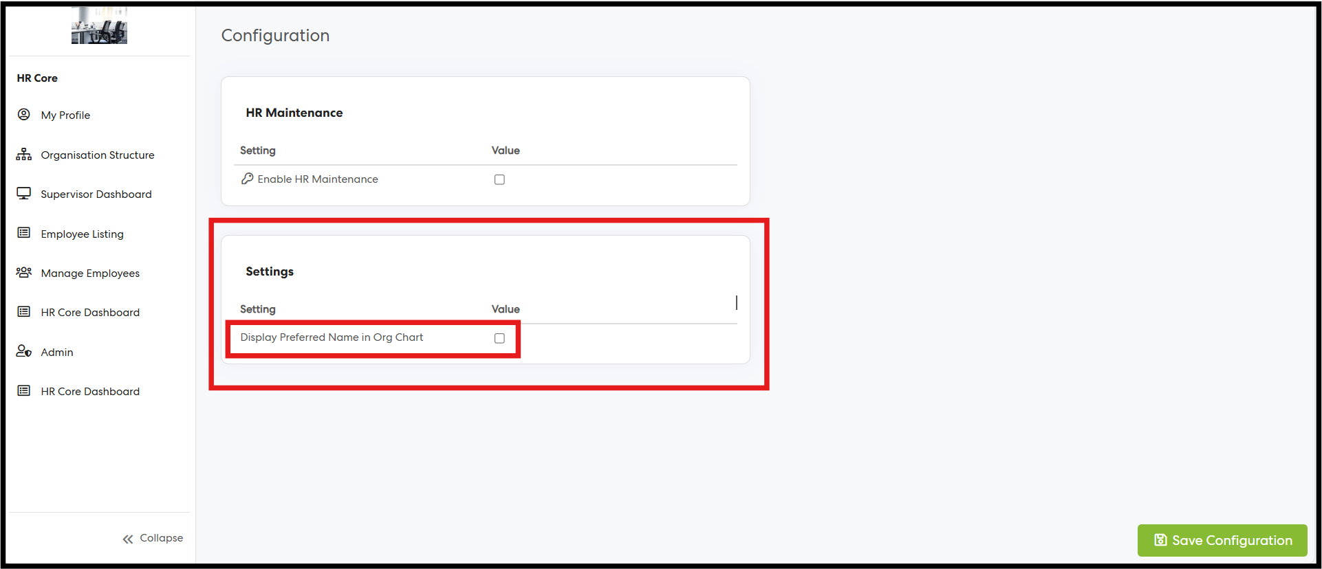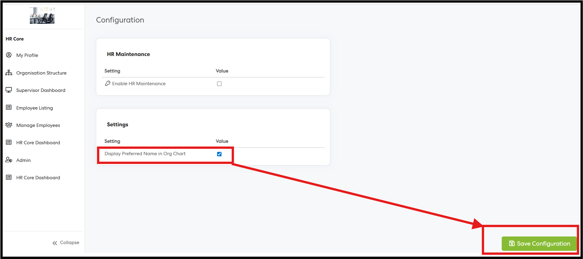 Navigation: Log in as an HR Core Admin → Navigate to HR Core → Admin Menu → General Settings → Configuration Page
