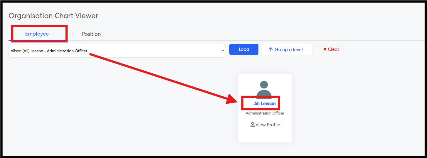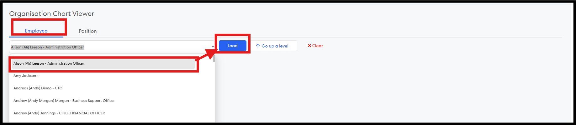 Step 6: In the Organisation Chart, the dropdown displays user names in the format First Name +(Preferred Name)+ Last Name. Select the required employee and click Load to view the chart.