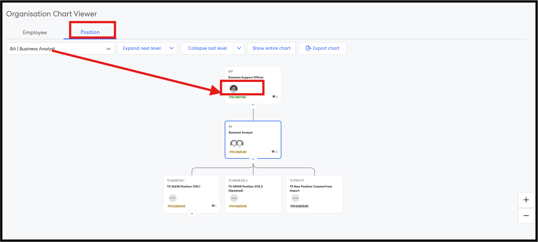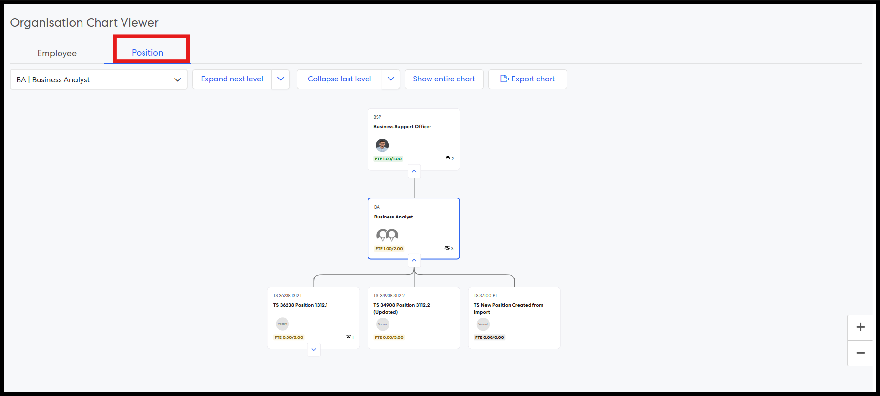 Step 8: Navigate to the Position Chart. By default, the logged-in user’s position org chart is displayed. Alternatively, select another position from the dropdown to load the corresponding position chart.